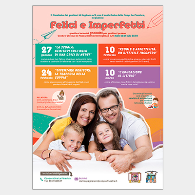“Felici e Imperfetti”: dal 27 Gennaio partirà un ciclo di incontri per sostenere i genitori nel percorso di crescita dei loro figli. Un progetto nato all’interno del Comitato dei Genitori di Sogliano a/R e sostenuto dalla Cooperativa LA FINESTRA, per attivare un confronto e cercare di rispondere ai tanti dubbi, perplessità, domande che spesso ci poniamo come genitori.
